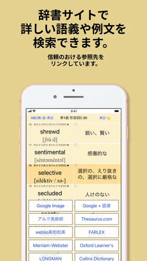 「日本語訳」のセル右上をタップするとチェックされ、チェックした単語を「単語帳」に登録できます。