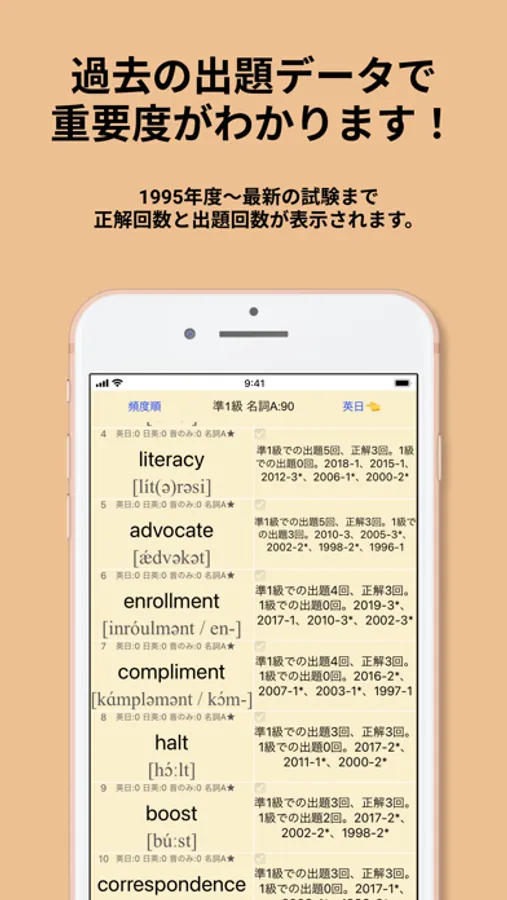英検の語彙問題は過去問から多く出題され、頻出の単語は繰り返し出題されています。アプリ内の各品詞のABCの範囲には正解として出題された単語と選択肢としての出題回数が多い単語をまとめています。A〜の順に優先的に学習することで効率よく合格点へ近づくことができます。
