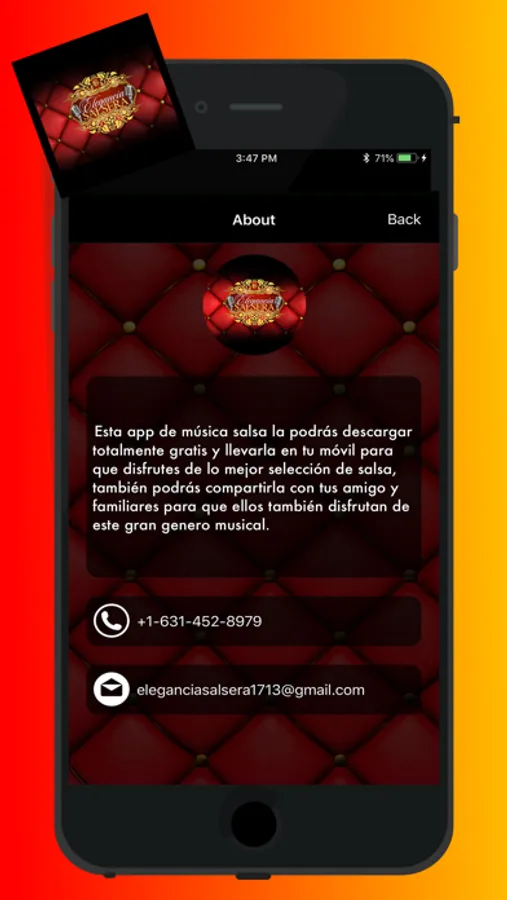 Esta app de música salsa la podrás descargar totalmente gratis y llevarla en tu móvil para que disfrutes de lo mejor selección de salsa, también podrás compartirla con tus amigo y familiares par que ellos también disfrutan de este gran genero musical. también puedes escucharnos desde nuestra web: www.eleganciasalsera.com