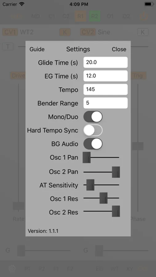 Separate glide controls for each oscillator, with a configurable maximum glide time of 120 seconds!