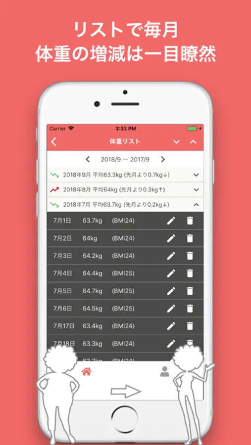 Weight4Uのリスト表示は今まで入力した体重データを簡単に修正と削除ができ、BMIもチェックできます。