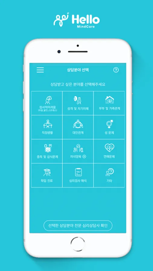 헬로마인드케어 앱은 일부 디바이스(iPhone 5, 5s, SE)를 지원하지 않습니다.#마음치유 #정신건강 #성인상담 #부부상담 #가족상담 #결혼상담 #연애상담 #허언증 #분노조절장애 #대인관계 #애정결핍 #트라우마 #공황장애 #불면 #자살상담 #위로 #자아성찰 #힐링 #명상 #성격개선 #성격고민 #도박중독 #무료상담 #알콜중독 #진로상담 #우울 #회사고민 #정신건강 #성고민 #육아고민 #외모고민 #인생상담 #온라인상담 #심리상담 #심리검사 #애니어그램 #자존감 #성소수자 #위로 #대면상담 #전화상담 #성폭력상담 #인간관계 #진로고민 #불안 #불면증