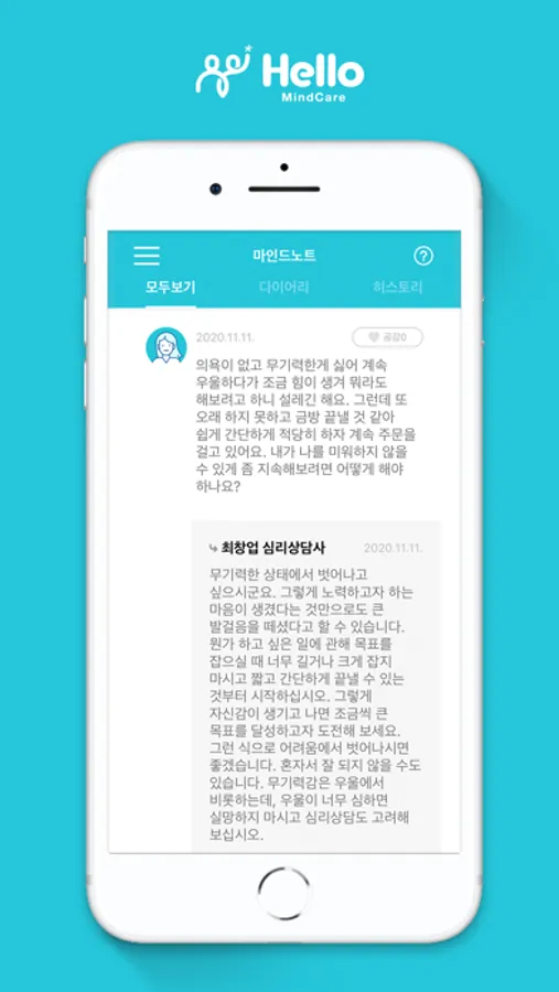 헬로마인드케어 심리상담, 고민상담 앱을 통해 나 자신을 찾아보세요.