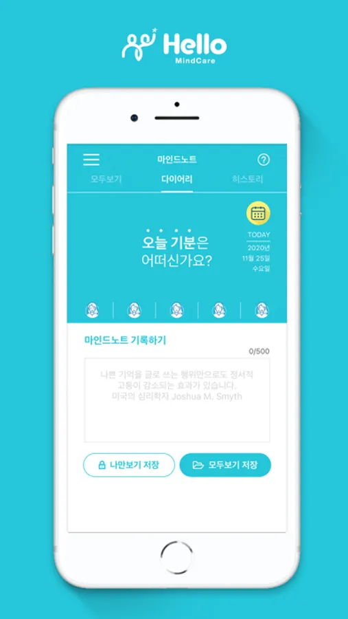 마인드노트-다이어리 기능을 통해 나의 생각과 감정을 정리할 수 있는 시간을 갖기 바라요.