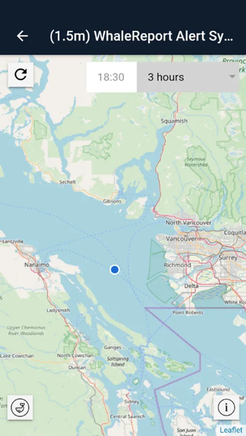 The WhaleReport Alert System will broadcast the presence of whales to shipmasters via SMS text message. The message will contain a link to a map showing the reported location of the whales, their direction of travel, and other pertinent information. Whale presence information will be obtained from real-time observations, sent in by trusted observers using the B.C. Cetacean Sightings Network’s existing WhaleReport app.