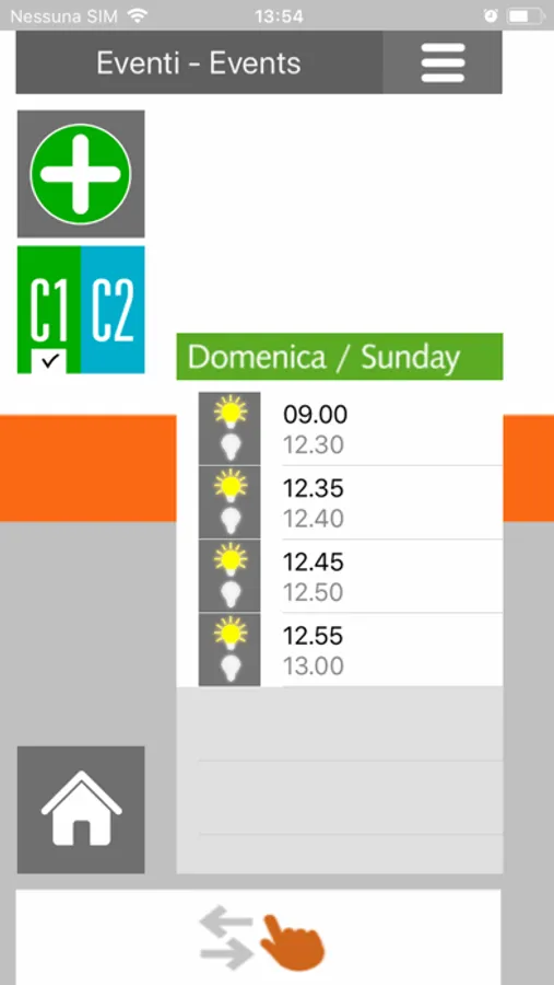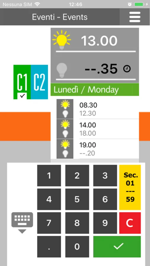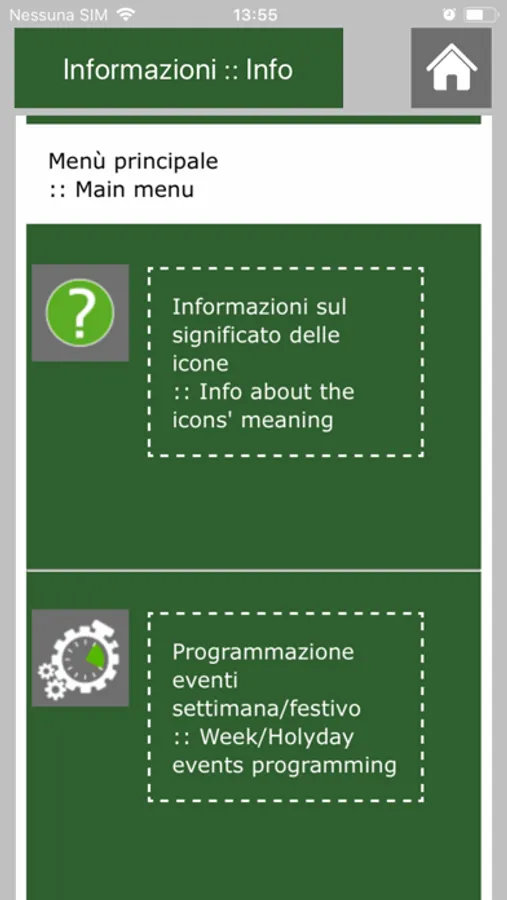 Nella App, un semplice menu ad icone ci indirizza verso le varie fasi della programmazione degli orari di intervento per i due relè interni al dispositivo (2 canali), consentendo di impostare tempi di accensione e spegnimento per entrambi, per ogni giorno della settimana. Per le vacanze è previsto un ulteriore programma, indipendente da quelli settimanali, per ognuno dei due canali disponibili. Il numero massimo di eventi (accensione/spegnimento) per ogni giorno è 48, per ciascuno dei canali. E' possibile anche impostare eventi di durata da 1 a 59 secondi.