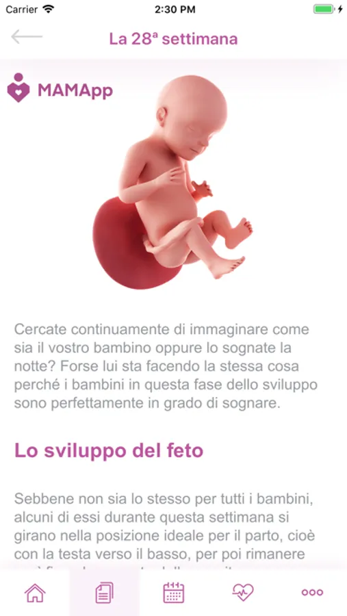 - più di 80 articoli curati da medici specialisti che illustrano la crescita e i cambiamenti del feto settimana dopo settimana