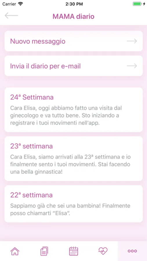 - il MAMA diario: un diario in cui riportare le vostre sensazioni e i messaggi per il bambino, con la possibilità di esportazione tramite e-mail