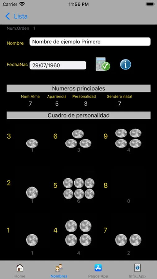 La lista (Nombre y fecha de nacimiento) es útil también para facilitar la relación de cumpleaños en cada día y mes del año. Dispone de la visualización del cuadro de personalidad y cantidad de textos explicativos sobre las características personales: El interior (número del alma), la apariencia o la personalidad del conocido a analizar.