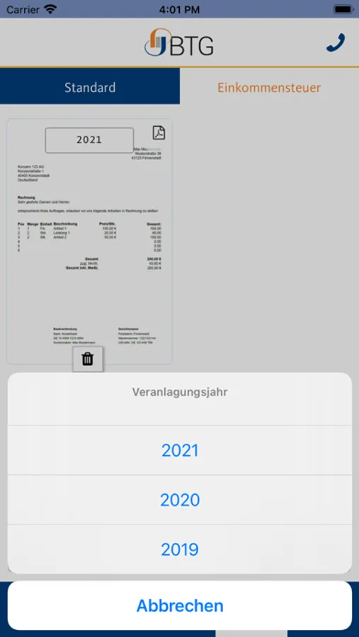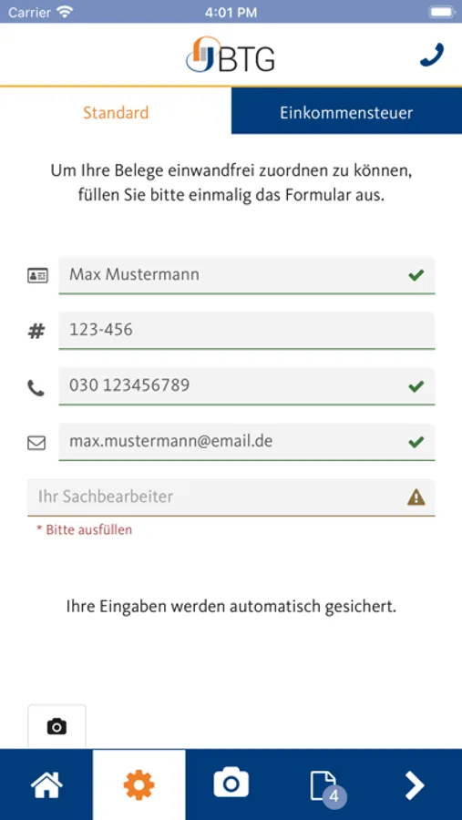 Machen Sie einfach ein oder mehrere Fotos von den Belegen und versenden Sie diese mit einem Klick direkt aus der App heraus an die BTG.