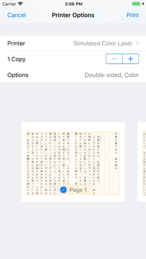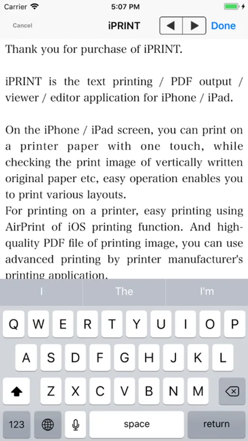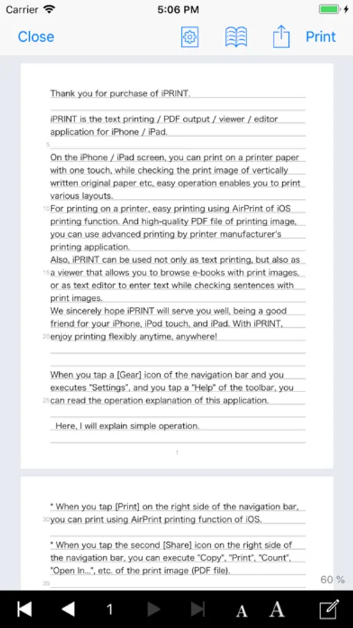 iPRINT is the text printing / PDF output / viewer / editor application for iPhone / iPad. iPRINT customized iText Pad, which has been popular as iOS advanced text editor, for printing on printer paper. iPRINT have specialized iText Pad's functions, such as vertical writing and the original paper layout "Aozora Bunko" style ruby display, for displaying printed images on printer paper. On the iPhone / iPad screen, you can print on a printer paper with one touch, while checking the print image of vertically written original paper etc, easy operation enables you to print various layouts.