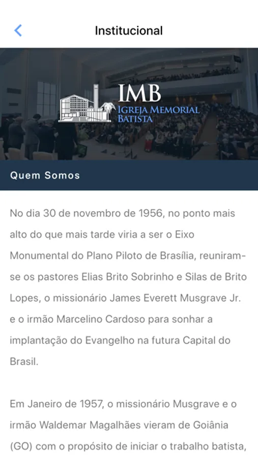 Aplicativo da Igreja Memorial Batista de Brasília. Acompanhe o notícias, estudos, cânticos e etc, tudo pelo aplicativo da IMB.