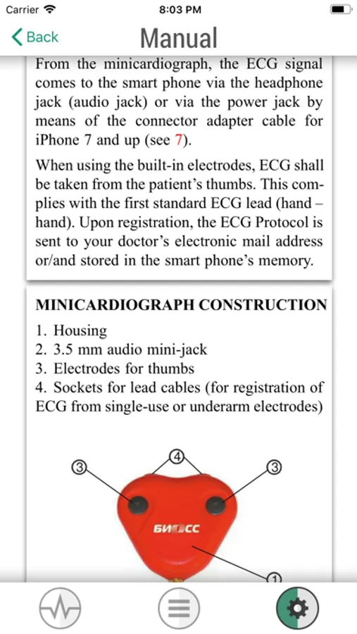 "Heart" is produced by the company BIOSS and has its site cardio.bioss.ru, it shows all the data of the device and indicates where you can buy it. The system (device and application) is designed for recording, storing and transmitting an electrocardiogram (ECG), which is captured from fingers in everyday life at any time and anywhere and corresponds to the first standard arm-arm channel. The ECG signal is transmitted from the device to the smartphone through the headset jack (headphones). The ECG is displayed on the smartphone's display. This allows the patient to monitor the quality of electrode contact and monitor the start and end of the recording. The duration of the ECG record can be set based on the recommendation of a doctor (from 30 seconds to 3 minutes). After registration the ECG remains in the memory of the smartphone and, if necessary, is transferred to the doctor as a PDF file by mail.