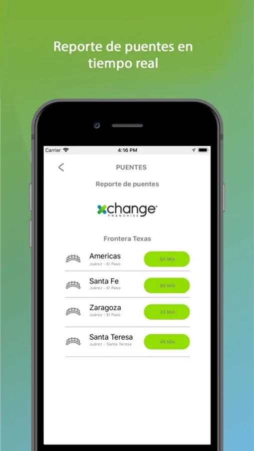 Xchange es una aplicación que forma parte de un sistema, el cual permite obtener seguros para tu vehículo, reporte de puentes internacionales en tiempo real y la información y consulta de precios en divisas que se ofrecen en los centros cambiarios afiliados.