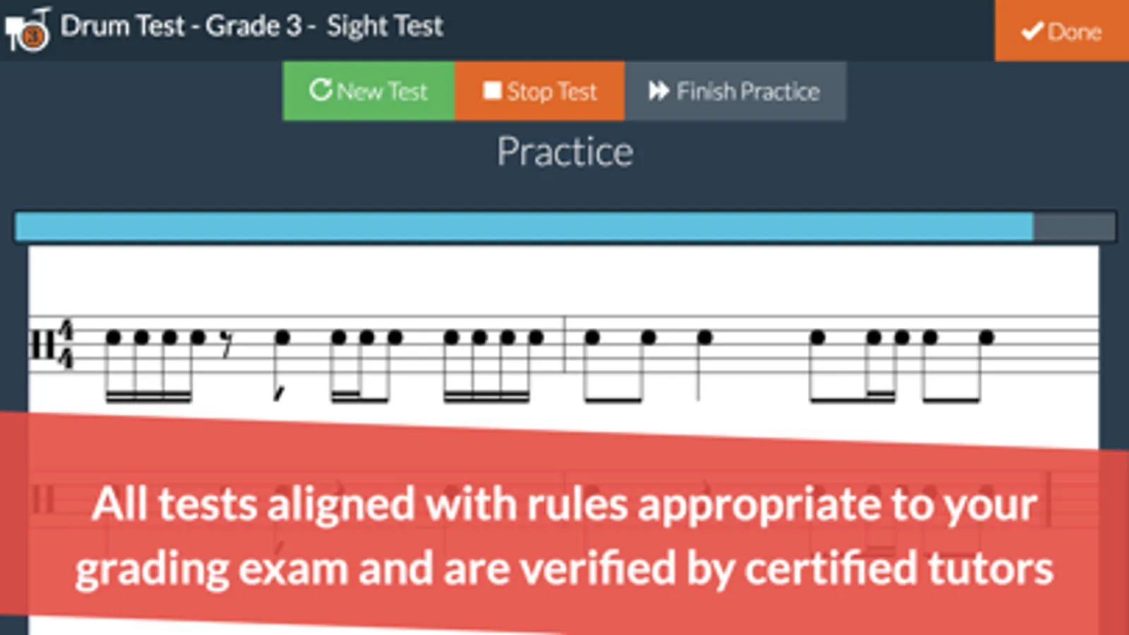 The ear and sight reading tests are a daunting aspect of your exam. Unlike the performance pieces and technical exercises you don't know what to expect so they can be difficult to practice for, especially without a tutor. Using the expert knowledge of our certified North London Drums tutors, the app will produce an infinite number of sight reading and ear tests examples, all within the rules and difficulty appropriate for your grade.
