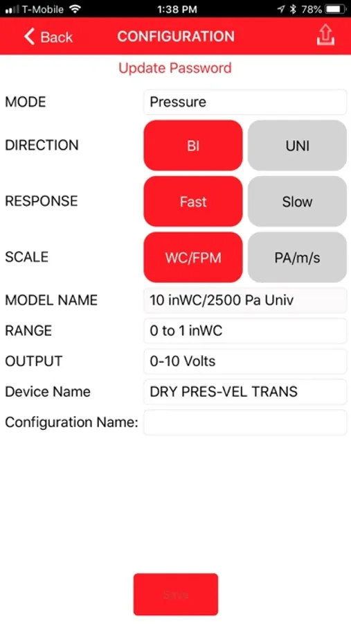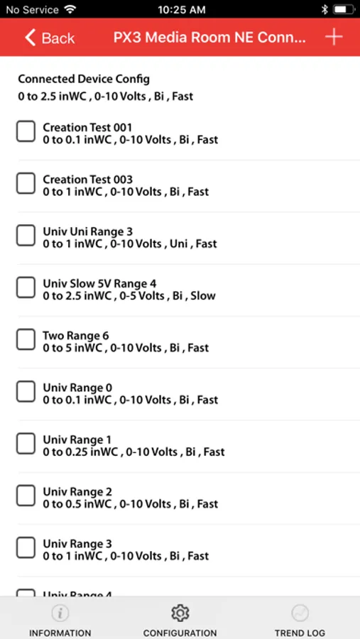 The Veris Sensors app provides the ability to view the PX3 sensor and configure a variety of field-selectable parameters remotely from a smart device via Bluetooth® wireless technology. The app allows users to create and store commonly used parameters that will reduce commissioning time and provide assurance that all parameters are properly configured with no call backs. The app can also create a trend log while connected, providing critical data for troubleshooting purposes.