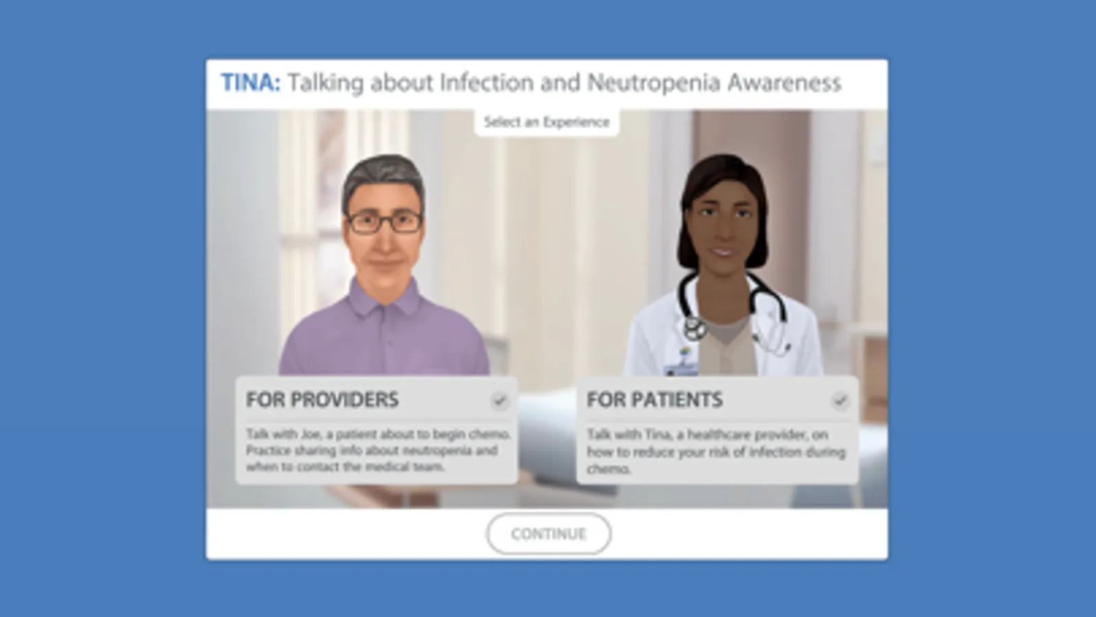 For healthcare providers: practice sharing information about neutropenia with your patients through an interactive conversation. Play the role of Tina, a virtual oncologist, and learn how to quickly and effectively have this conversation to achieve better adherence and outcomes. Then meet a virtual patient and practice a realistic conversation.