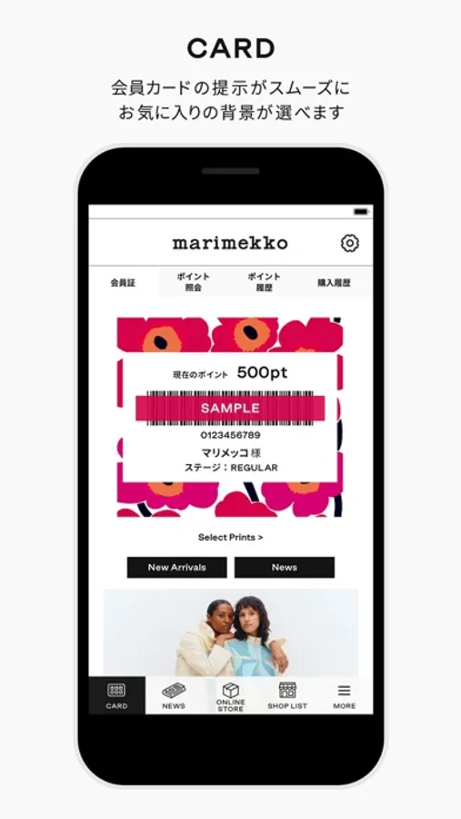 会員証のデザインはお気に入りの柄でカスタマイズ可能。ウニッコを含む人気の定番柄や最新シーズンの柄などから、お好きなものを選んで着せ替えることができます。