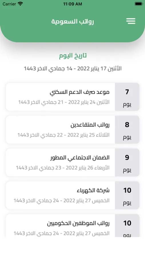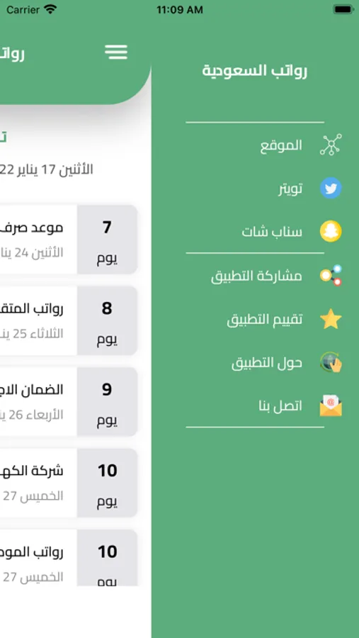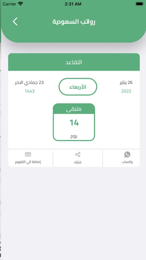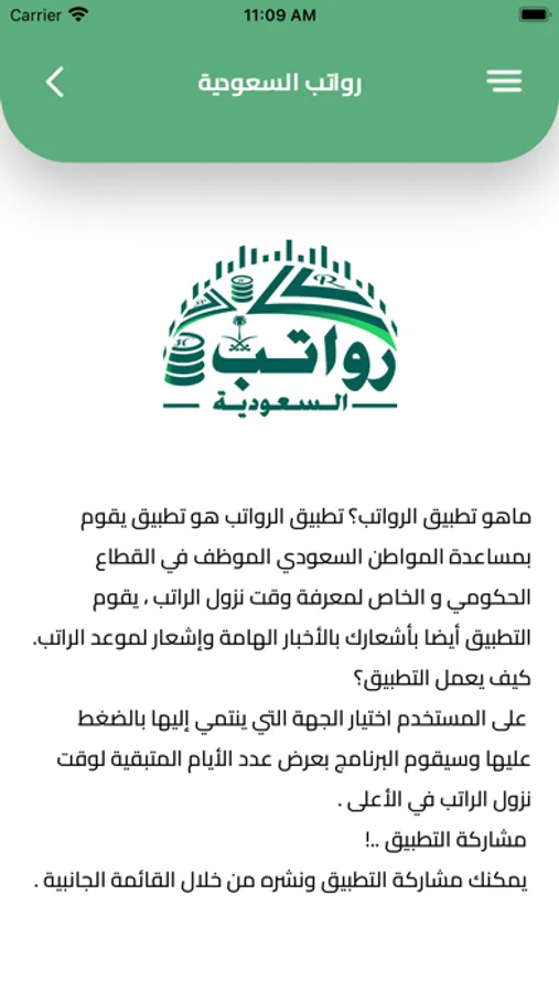 رواتب السعودية الجديد يذكرك و ينبهك بموعد صرف جميع رواتب الموظفين الحكوميين والشركات والمؤسسات الحكومية ورواتب المتقاعدين وحساب المواطن والضمان الاجتماعي الجديد المطور وحافز وشركة الكهرباء وأرامكو ، يمكنك مشاركة اي رواتب من خلال اختيار اي قطاع تنتمي إليه وتقدر تضيف الراتب في التقويم ينبهك عند نزول الراتب ، راح يوصلك اشعار عند نزول الرواتب او عند تحديث اي موعد للرواتب او تأجيلها تطبيق رواتب السعودية الجديد يمكنك الإعتماد عليه
