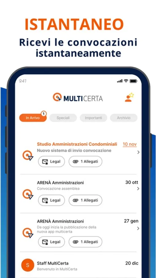 - Ritrovare i documenti immediatamente: All'occorrenza troverai tutte le comunicazioni dell'amministratore nell'APP, senza dover rispondere o confermare la lettura, senza rischio di SPAM e potrai scaricare tutti gli allegati, anche quelli più pesanti;