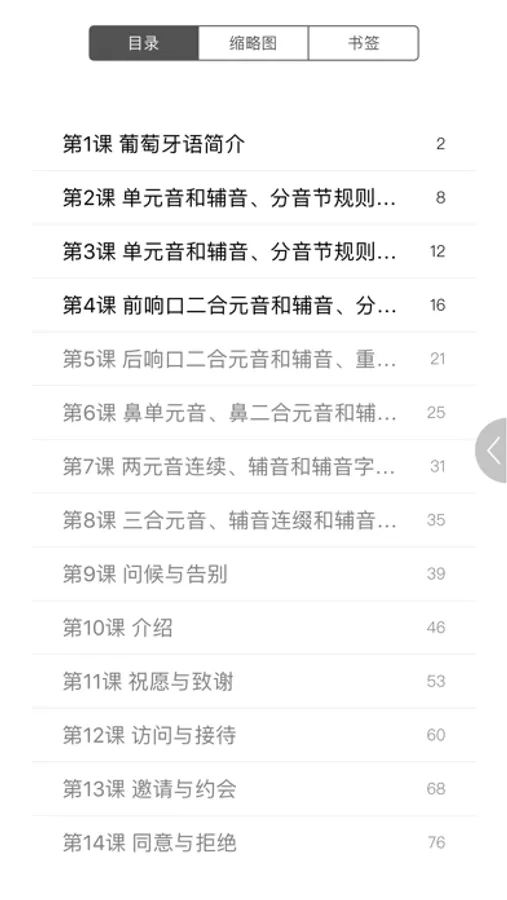本书由30个单元、两部分组成,即前8个单元的语音部分和9到30单元的课文部分。语音部分内容包括发音和语音辨析练习。课文围绕一个话题由两三段对话组成,配以词汇、日常用语、语法解释和文化小贴士,并配以图片。本书具有普及性、渐进性、自修性的特点,是葡萄牙语初学者的理想入门教材。