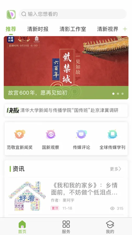 该应用平台发布内容全面展示了清华大学新闻与传播学院的实践教学成果。包含了学生原创的部分优秀实践作品,其目的在于给学生作品一个发布的窗口及交流的平台。同时展示的内容还有学院同学、老师参与实践活动的点滴收获以及其他与实践教学密切相关的内容。