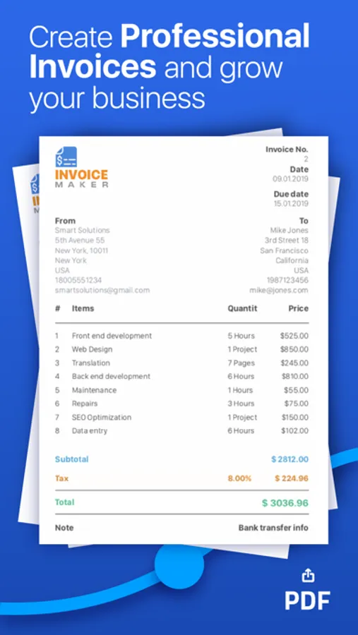 Preview each invoice before sending to make sure you are not missing out on any details. Add your company logo with just a few quick taps to make your invoices even more professional. No matter what your business is, what type of services you offer, with our Invoice Master your business and your devotion to your customers will always look highly professional and