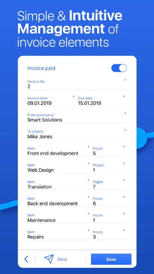 Save your companies, items you offer and clients you work with. Your invoices can have as many or as few details as you wish. Add your desired payment method for each invoice individually, or create a template for all invoices.