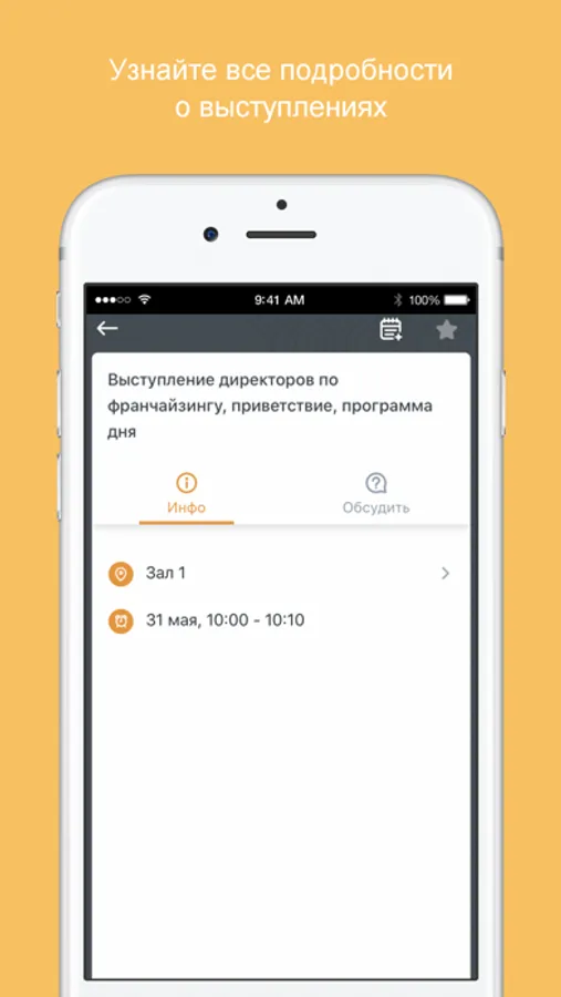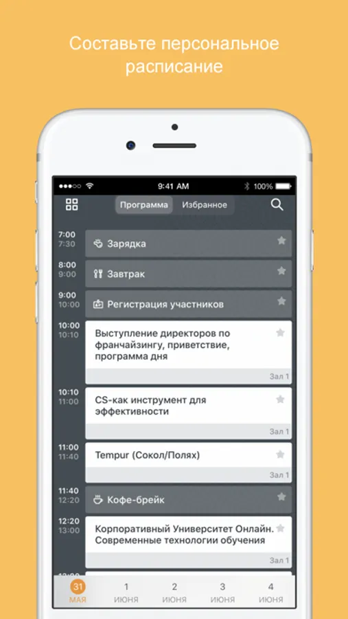• составить собственную программу и получать оповещения о начале избранных докладов;