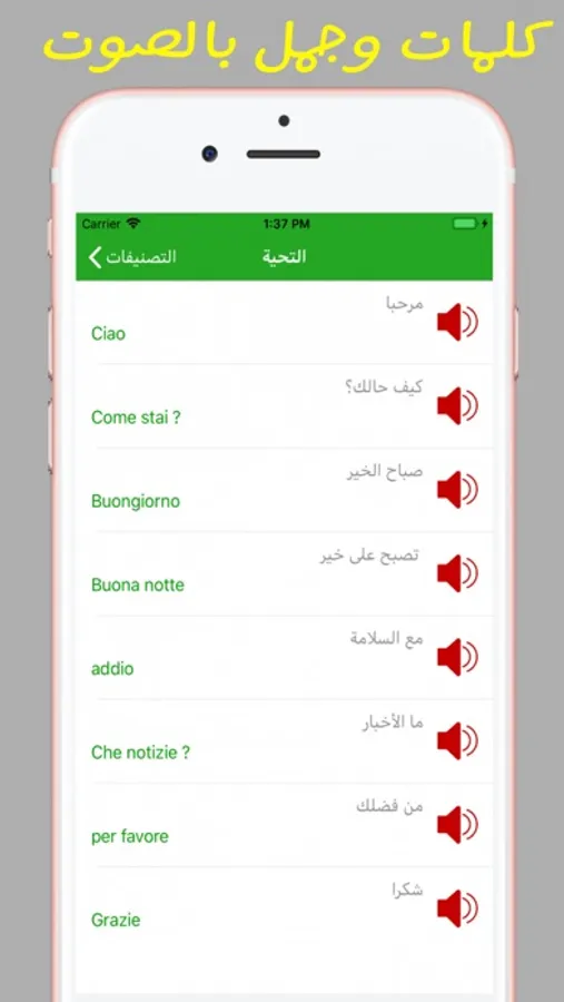 تطبيق تعلم اللغة الإيطالية بالصوت هو تطبيق يحتوي على عدة أقسام كل هذا بالصوت وبوضوح ثام وأيضا بالكتابة.