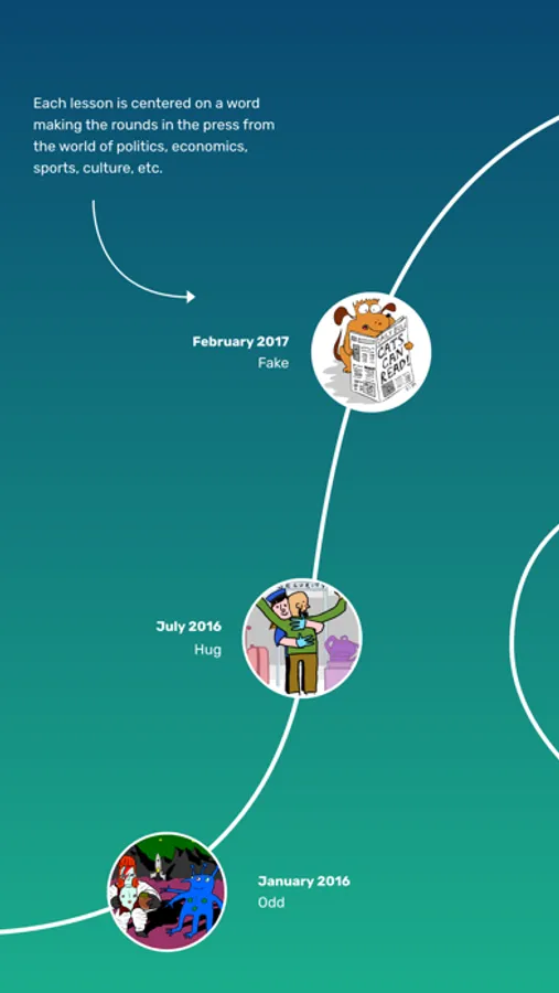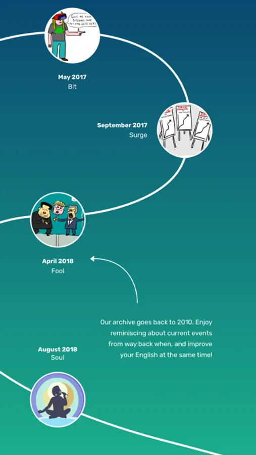 Words in the news. Each lesson is centered on a word making the rounds in the press from the world of politics, economics, sports, culture, etc. Learn vocabulary, idioms, definitions and more while taking a fun look at the headlines, past and present. Our archive goes back to 2010. Enjoy reminiscing about current events from way back when, and improve your English at the same time!