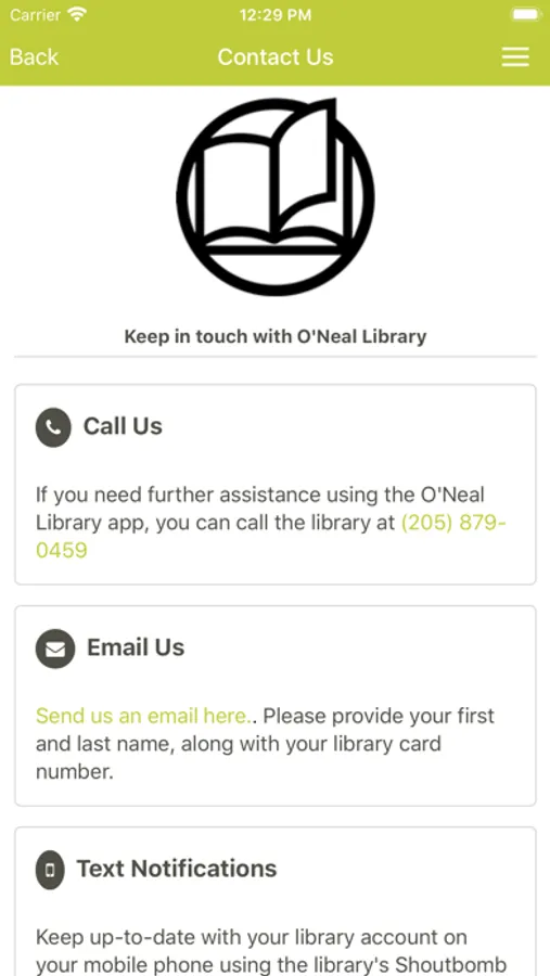 The O’Neal Library app is your gateway to the library’s services from your phone or tablet. You can check due dates, renew eligible items, store your library card, and search the library catalog.