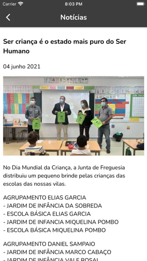 Disponibiliza as últimas notícias e uma agenda de eventos, consultáveis sem ligação à Internet. Dá acesso aos serviços da junta, à rede escolar, ao associativismo e a documentos oficiais.