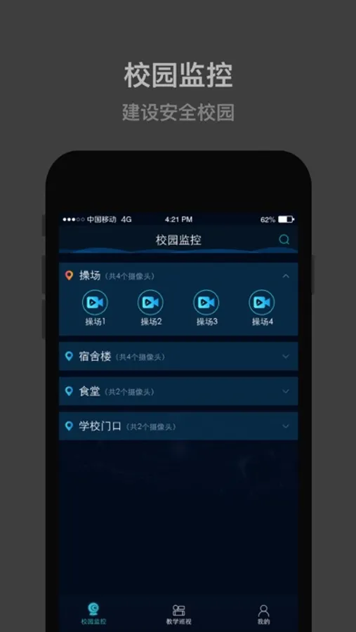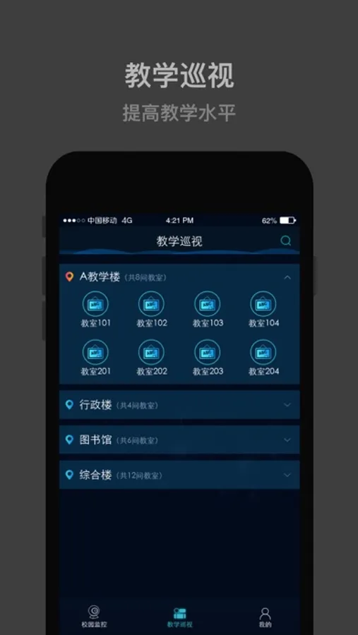 校园巡视APP通过对教室、校园各区域的视频监视信息一体化全方位监控管理,实现在线监控校园安防、在线巡视课堂教学情况、校长远程巡课、远程考场巡视:
