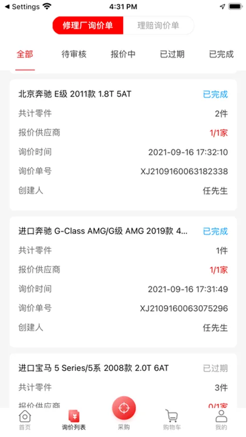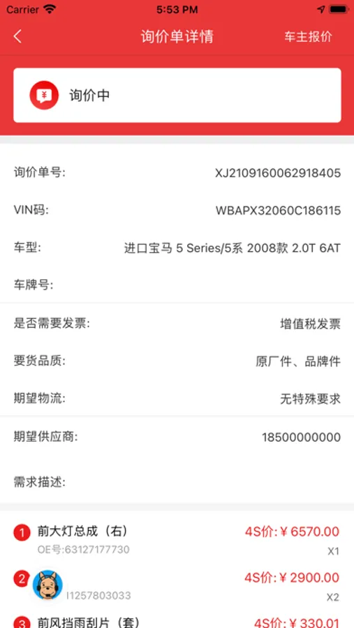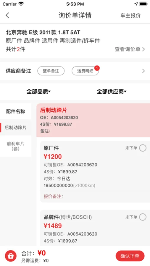 询报价:修理厂发布询价,汽配商进行报价。同时,由于平台与供应商库存已实时对接,很多常用配件已实现一秒报价,极大提高了汽配交易效率。