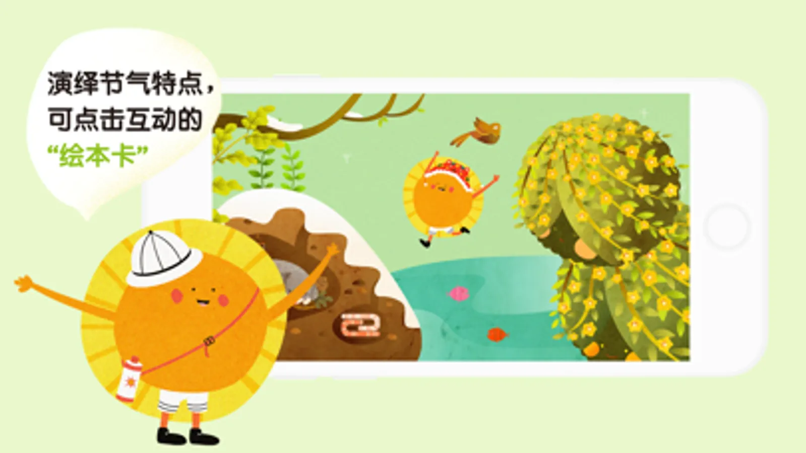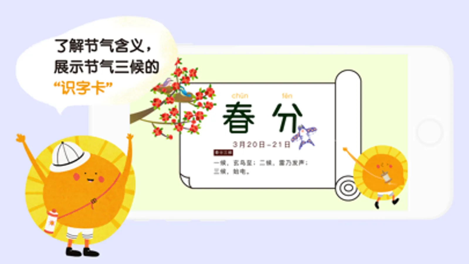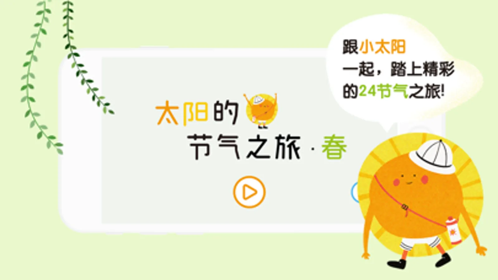 太阳的节气之旅·春,包含了春天的6个节气——立春、雨水、惊蛰、春分、清明、谷雨。我们把太阳作为主角,让他带着小朋友去到不同的“节气小岛”。每个节气都由三张互动卡片组成。
