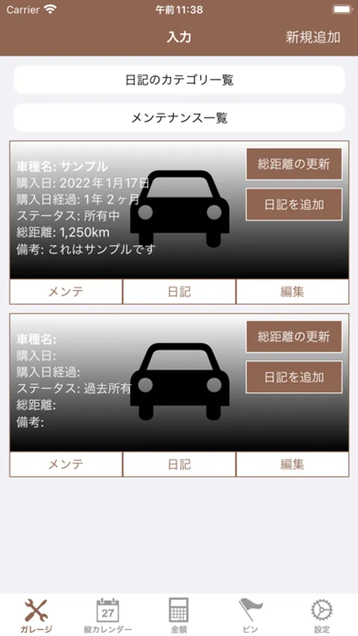 車のメンテナンスやドライブなどの日記を記録できるアプリです。