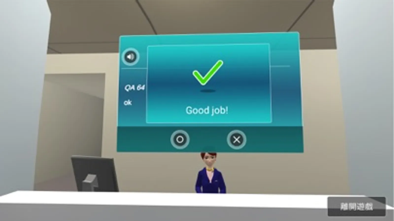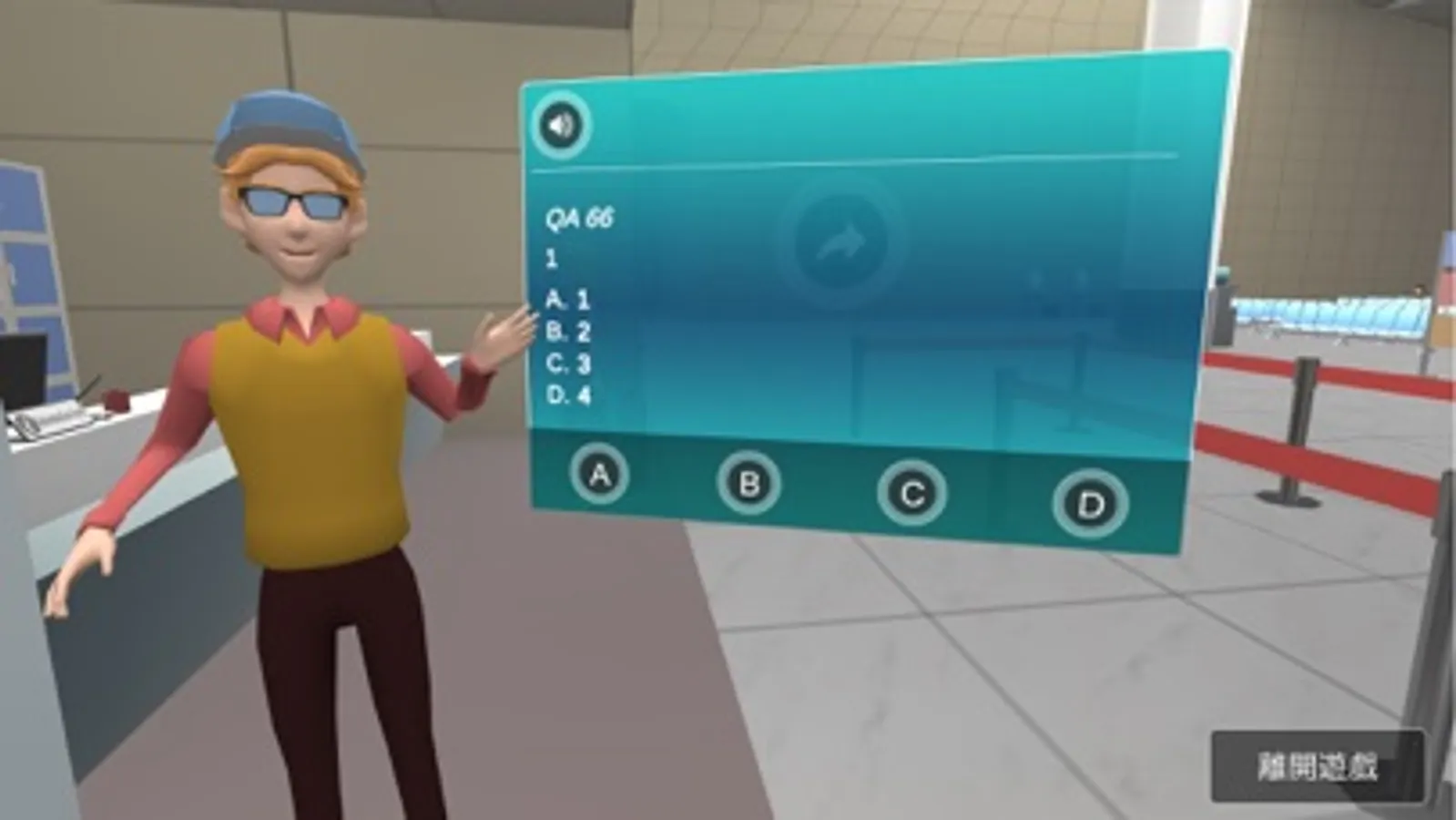 整個課程內計有機場大廳、便利商店、出境關卡、餐廳、機艙、諮詢服務台、過境旅館、航站捷運等8個3D虛擬場景及對話虛擬角色,每個場景內提供3個應答點,學生可自由選擇要由哪個關卡開始。過程中,虛擬角色將會以英語提問,學生可依題型方式予以答題。