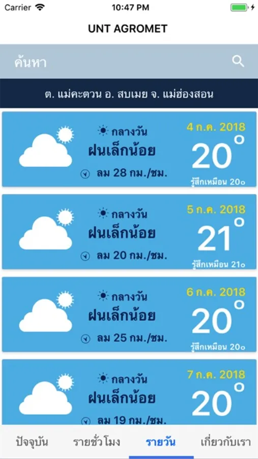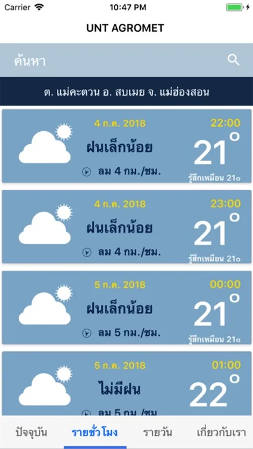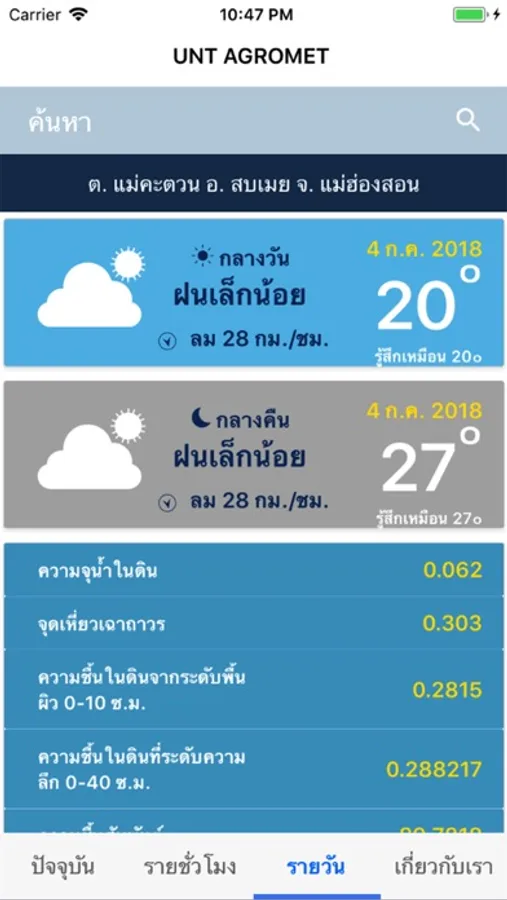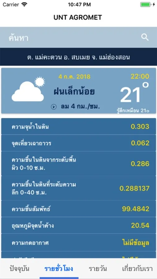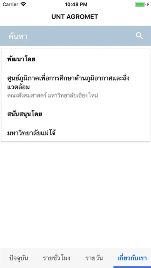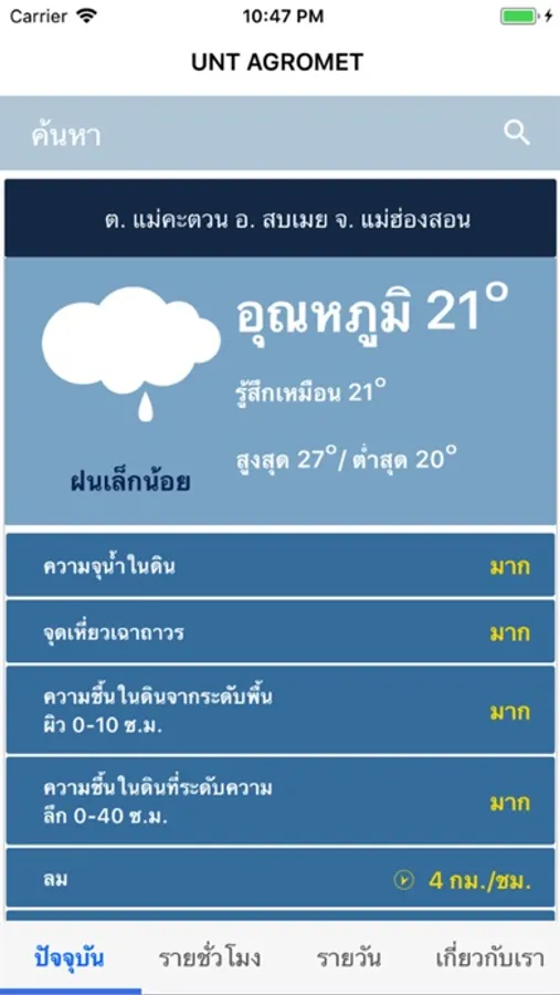 UNT AGROMET คือแอพพลิเคชันการพยากรณ์อากาศเพื่อการเกษตร เพื่อสนับสนุนการตัดสินใจแก่เกษตรกรในพื้นที่ภาคเหนือตอนบนของประเทศไทยในการเฝ้าระวังสภาวะอากาศที่จะส่งผลกระทบต่อพืชผลผลิตทางการเกษตร โดยแสดงข้อมูลพยากรณ์อากาศรายชั่วโมงล่วงหน้า 5 ชั่วโมง เช่น อุณหภูมิ ฝน ลม ความกดอกาาศ และข้อมูลพยากรณ์อากาศรายวันล่วงหน้า 10 วัน มีระบบข้อความแจ้งเตือนสภาพอากาศรุนแรงที่จะมีผลต่อพืชผลทางการเกษตรล่วงหน้า เช่น พายุฝนฟ้าคะนอง พายุฤดูร้อน ความชื้นในดิน ให้ข้อมูลด้านอุตุนิยมวิทยาเกษตร เช่น ความความจุน้ำในดิน ความชื้นในดิน และจุดเหี่ยวเฉาถาวร เพื่อเฝ้าระวังการขาดแคลนน้ำของพืชผลผลิตทางเกษตร