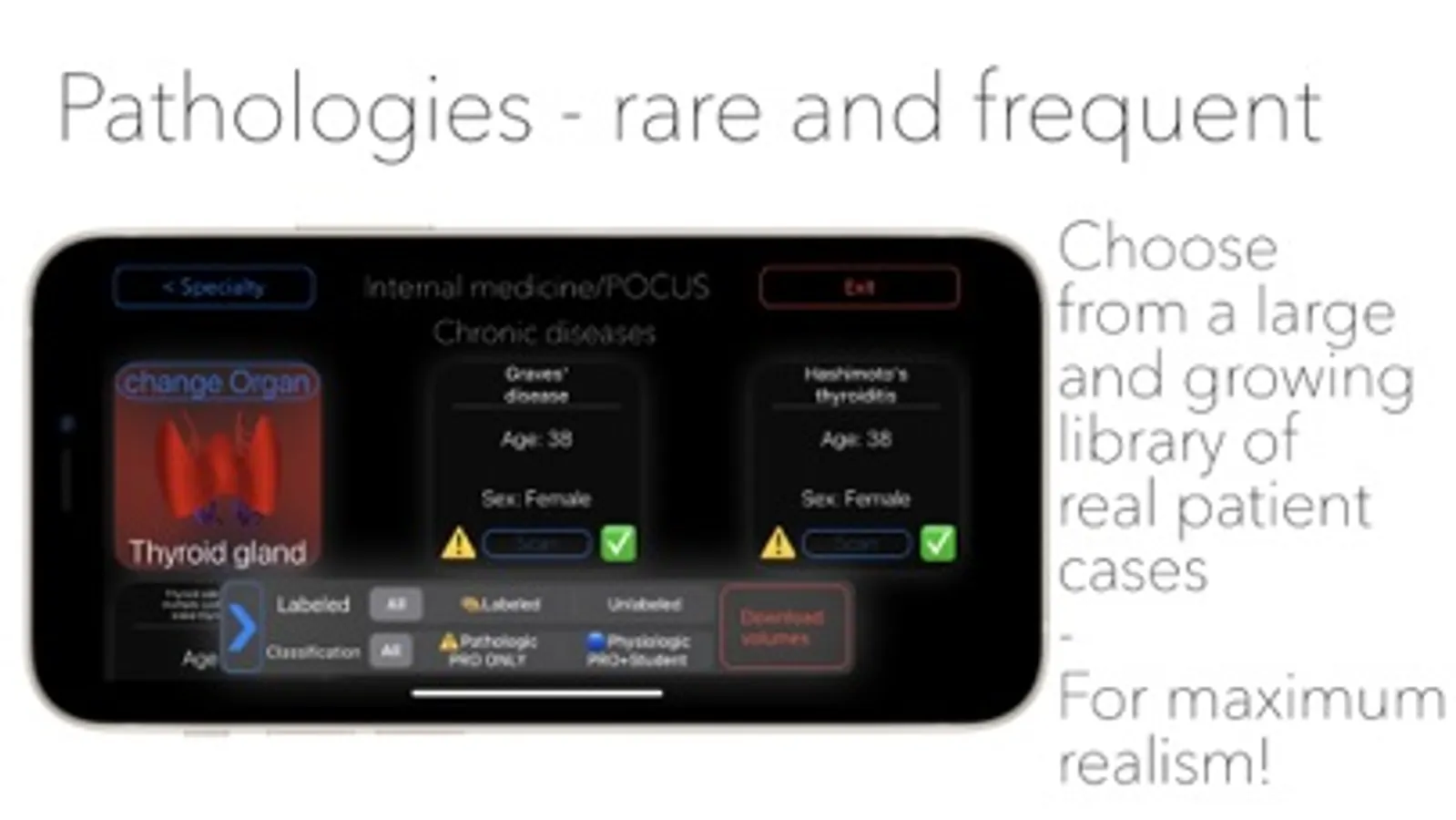 Scanbooster features an ever-growing array of both physiologic cases and pathologic cases as well. For the first time, all medical doctors can scan even the rarest pathologies themselves -instead of only looking them up 2d in the textbook.