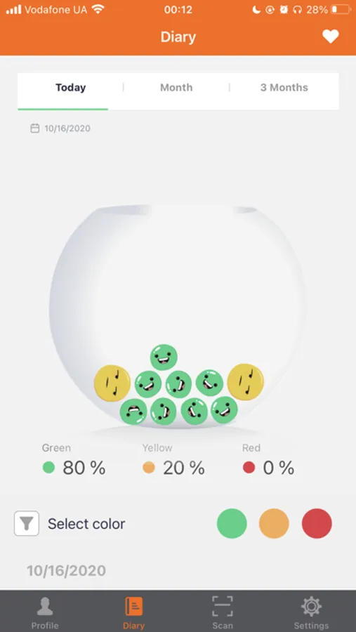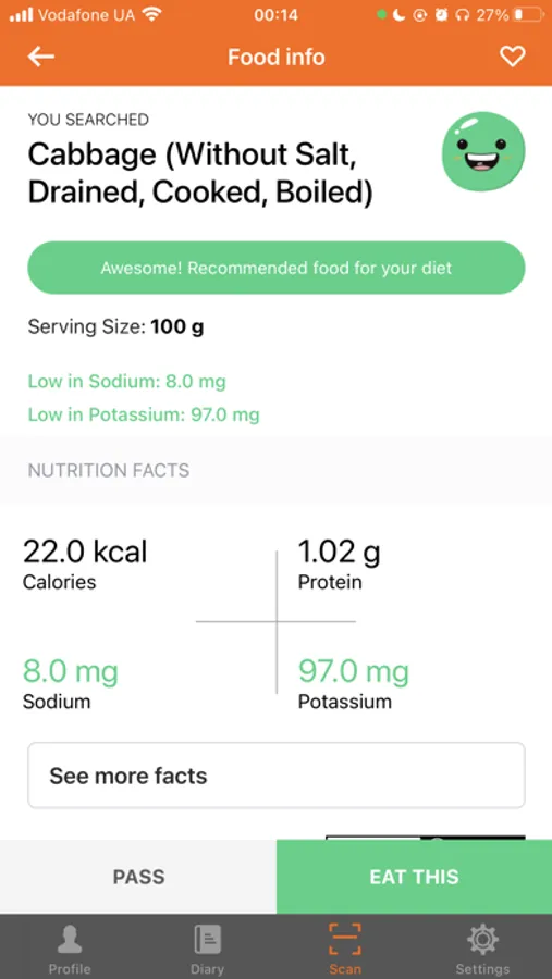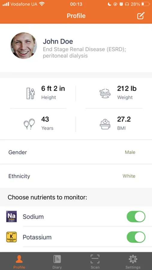 We created a large database of food items with matching bar codes and labeled each item on the basis of food constituents of sodium, potassium, and in the near future phosphorus, using different colors and symbols (for color blind). Your individual unique food basket holds all food you have consumed over time, with a goal being more than 75 % of green, minimal yellow, and NO red labeled diet items in order to comply with the recommended restrictions. The diet compliance is based on the recommended reduced daily consumption of sodium “two grams”, and potassium “two grams”. The recommendations are based on one serving of the consumed item. We labeled green color for appropriate food, yellow - food to avoid, and red – not recommended to consume. The more items you scan the more accurate your basket is.