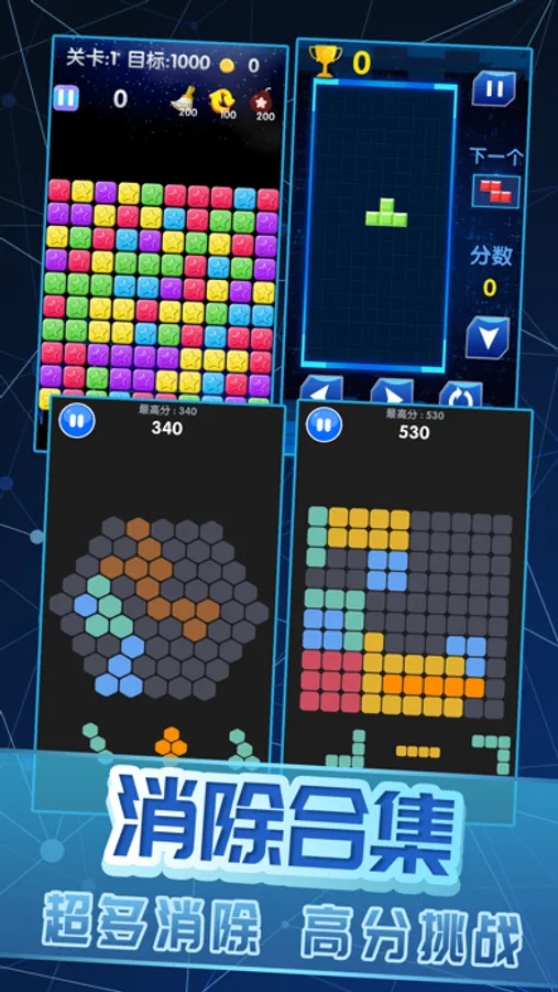 欢乐六边形中包含了连线、滚球、数独、华容道、推箱子、消除星星等经典益智游戏,简单好玩又有趣。