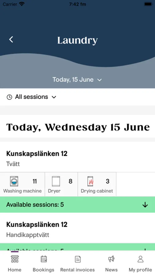 The app give you an overview of your upcoming and completed bookings. If there are any faults reported on for example a washing machine it will clearly show what the problem is on your booking card. Of course you will receive a reminder before you’re booking starts as well as when it ends. The app also give you the opportunity to receive news about activities in the area you live.