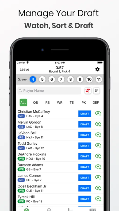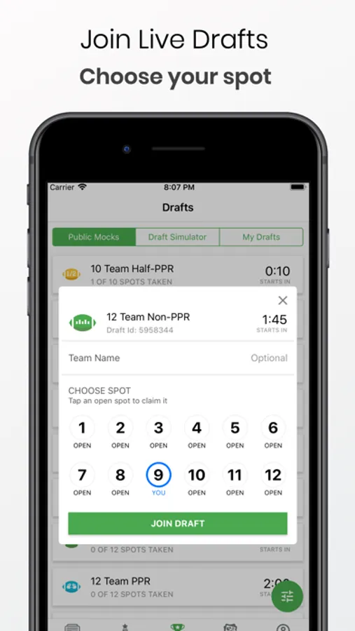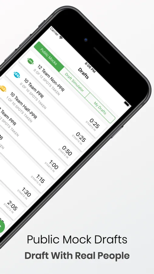 We provide the most active public mock drafts against real users. Join a variety of draft formats such as Non-PPR(Standard), PPR, Dynasty, Dynasty Rookie and 2-QB. Organize your players list, create a watch list, view the whole draft on a scrollable board and chat live with other users. When you enter a draft, our draft room will provide you with easy access to players, a watch list, your team, a fully functional draft board and chat with other players.