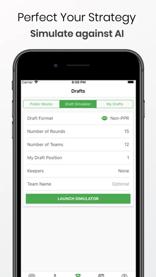 Run simulations against our adaptive AI which will allow you to quickly test all of your different strategies against the most likely picks in your drafts. Our Draft Simulator is highly configurable in draft formats, rounds, number of teams and your position.