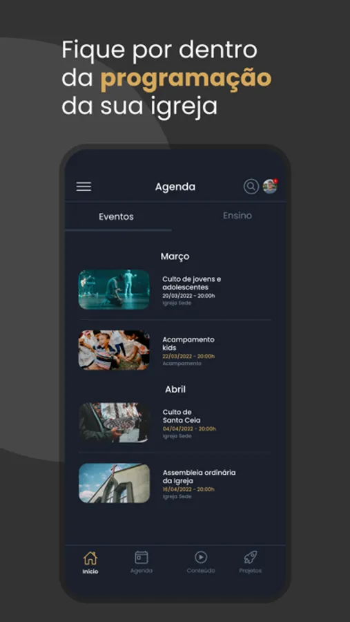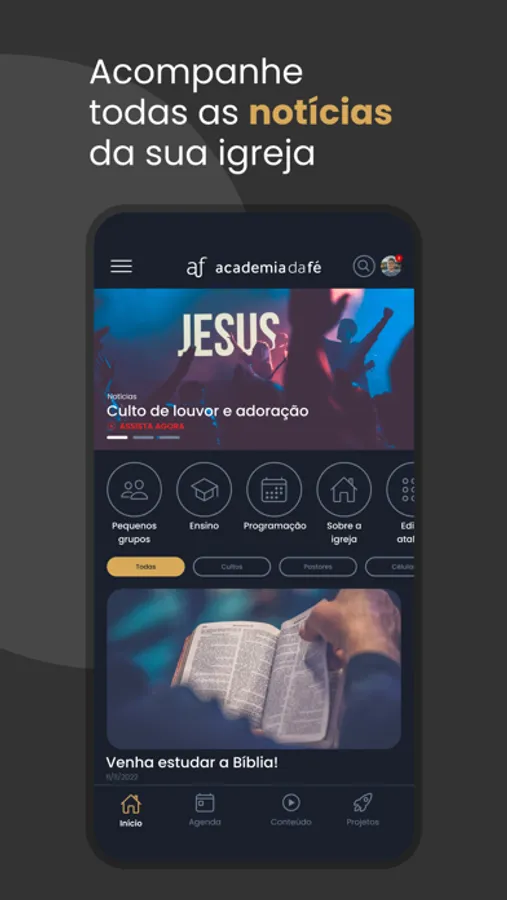 Recursos disponíveis no Aplicativo: Notícias, Agenda da igreja, Eventos, Conteúdos, Projetos, Transmissão ao Vivo e Módulo Ensino.Em nosso aplicativo, você poderá acompanhar os nossos eventos, ficar a par das notícias mais recentes em nossa igreja, ter acesso aos link dos nossos materiais e muito mais!
