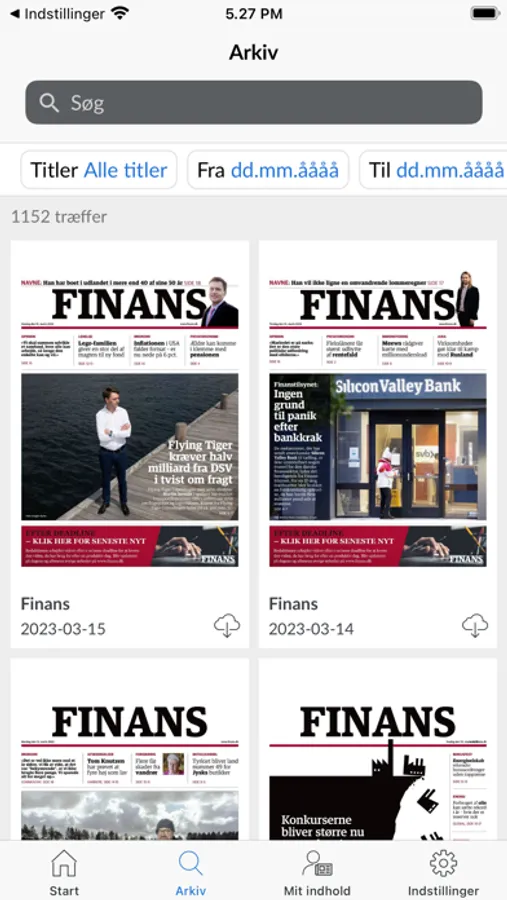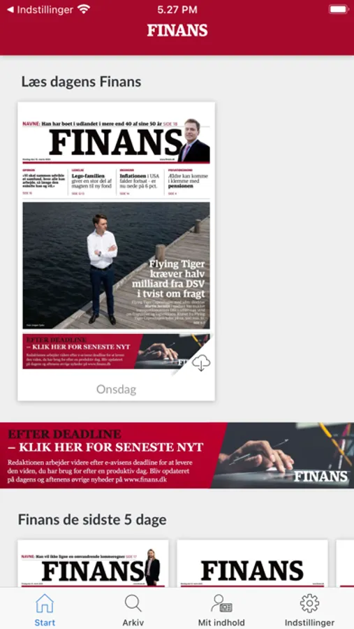 Finans’ e-avis giver dig overblik over dagens erhvervsnyheder på iPhone og iPad. Finans’ e-avis udkommer alle hverdage, men vi giver dig adgang til den allerede kl. 20.30 dagen før. Få det store overblik over alle dagens relevante nyheder om erhvervslivet og økonomien, læs e-avisen i det format, der passer dig bedst og benyt søgefunktionen til at finde præcis den artikel, du ønsker at læse.