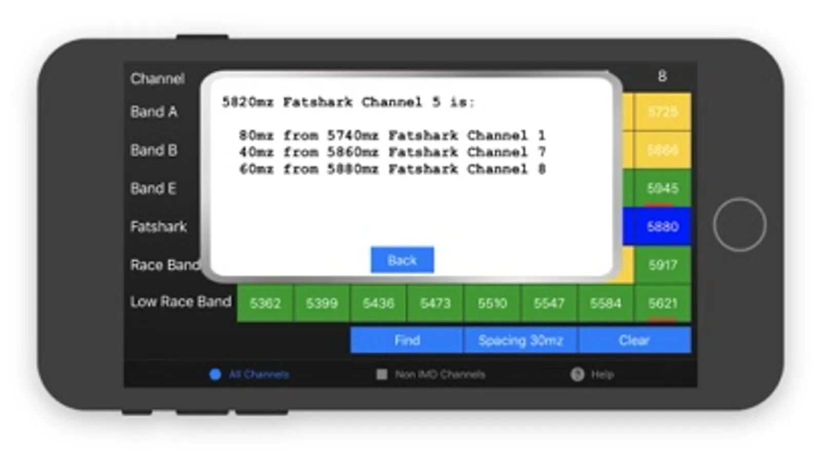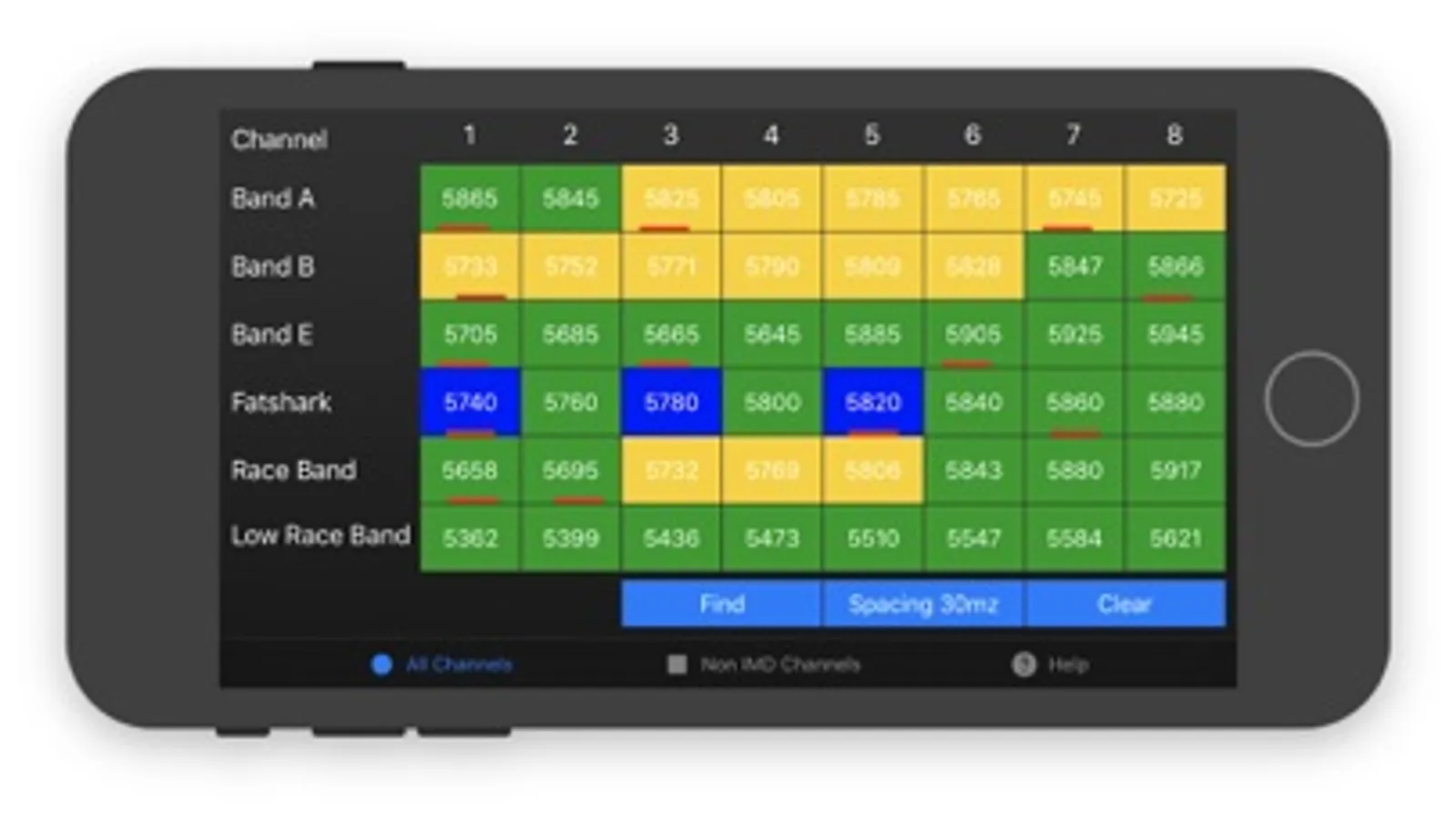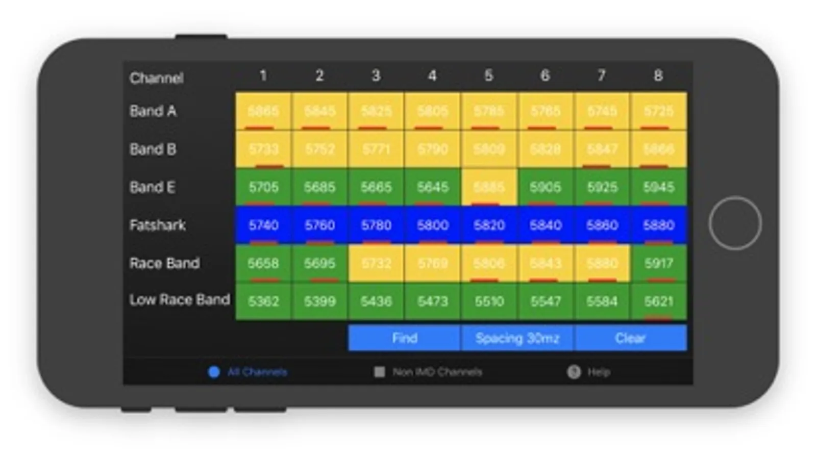 FPVFreq solves the problem of finding VTX frequencies that do not interfere with each other. Ever been half way down the field inverted in the middle of your best hang time of the day and have someone fire up their VTX and it stomps all over your video? FPVFreq makes it easy to find clear channels to use without having to waste your flying time experimenting by manually changing VTX channels. The app calculates safe distances between channels and warns you when two or more channels might interfere with each other or generate IMD (intermodulation distortion) which can cause ghosting to appear in your goggles or display device. If several pilots are flying and another pilot shows up you can use the Find feature to easily select new channels that won't have interference on them or worse won't cause interference. FPVFreq has several presets you can use made of well known frequencies that will not interfere with each other and the app covers all of the current FPV bands. Simple to use and works with the iPhone and iPad.