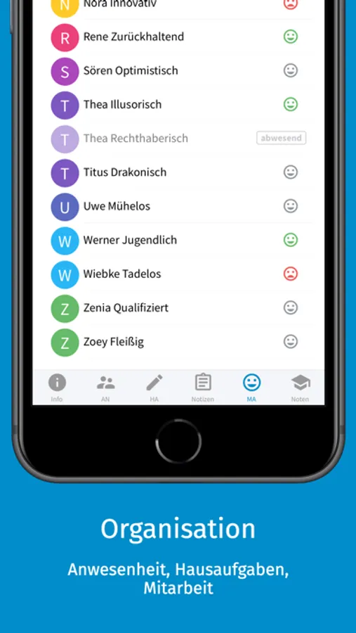 - Fehlzeiten, Hausaufgaben und mündliche Mitarbeit unaufwändig erfassen und auswerten