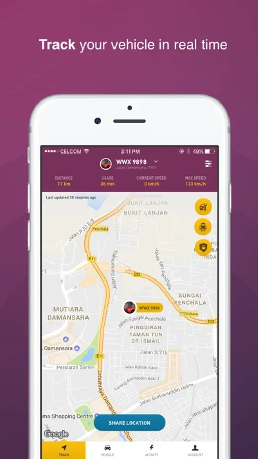 - receive notifications when vehicle starts, enters a checkpoint, exits a certain area or having low battery.